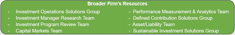 | The Team has extensive experience advising institutional clients on the prevailing investment and governance issues affecting their respective investment portfolios and operational structures. Client portfolios include, but are not limited to: endowment, foundation, corporate operating and pension, defined contribution, and public pension funds. | ||